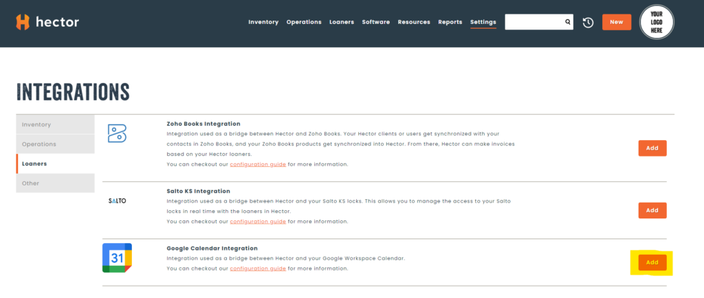 Connect to your Hector instance as an administrator and navigate to the “Settings” menu, and then click on “Integrations”. Once inside, choose the “Google Calendar Integration” in the “Loaners” tab and press “Add”.