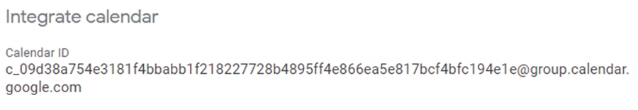 Here is the procedure to use it if you wish. Once a new calendar is created, navigate to its settings. You will find, in the Integrate calendar section within the Calendar Settings page, the calendar ID required for the integration:
