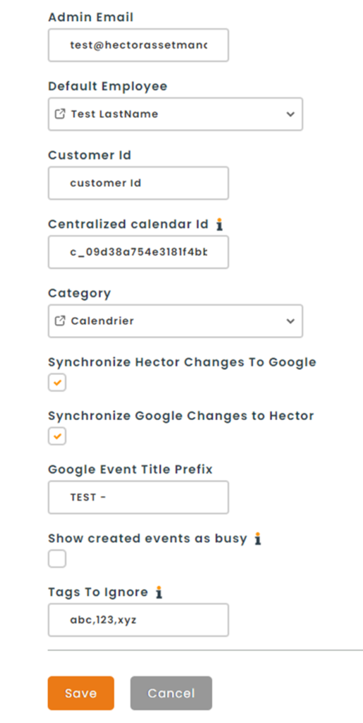 - Default user: The user who will be used when creating an event from Google Calendar if the requester of a resource (room, location, etc.) does not have a Hector account.