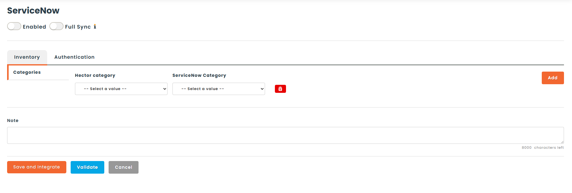 Now that your ServiceNow instance is ready, you can configure the integration in Hector. Navigate to Settings > Integrations > Inventory > ServiceNow and click Add.