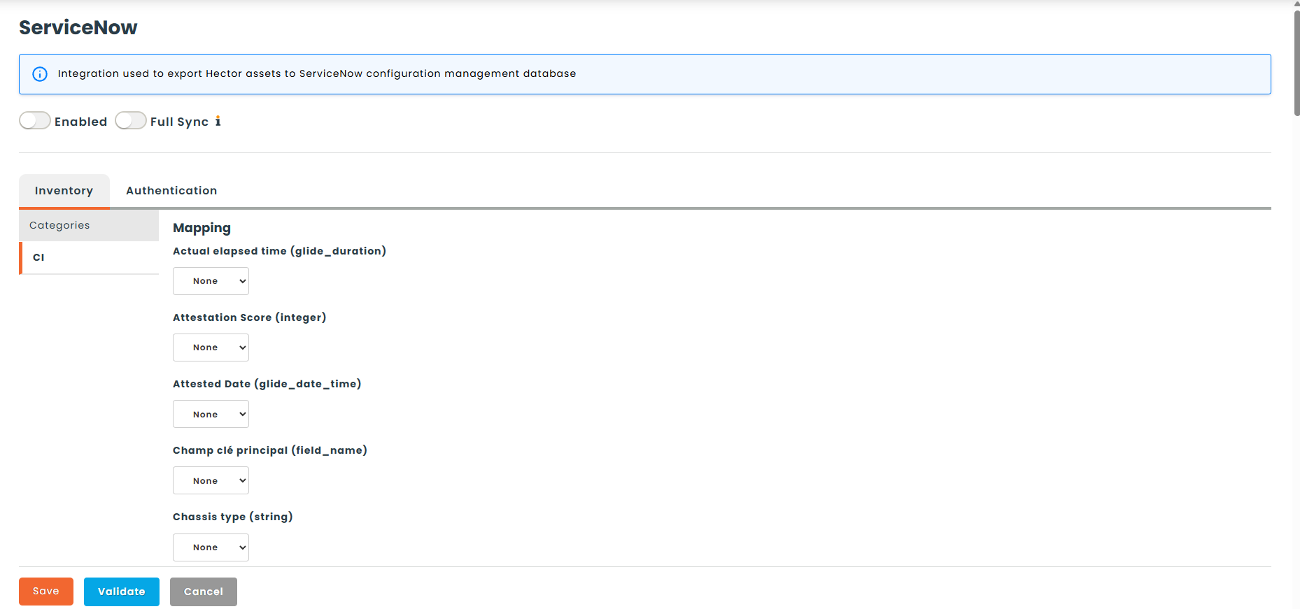 Once you have saved at least one category mapping, the CI Fields sub-tab becomes available. This step is optional but recommended if you want to push additional Hector data into ServiceNow Configuration Items beyond the base asset fields.