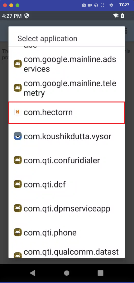 4. In the list of applications/activities presented, select the Hector app. It is named com.hectorrn. Once the app is selected, its list of activities will appear. Select *.