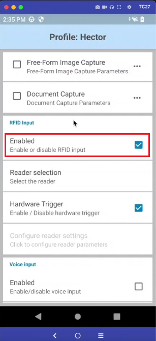 This step is optional. If you wish to use RFID technology, simply enable the option in the previously created Hector profile in DataWedge when the Zebra mobile device is placed in the Zebra barcode scanner.