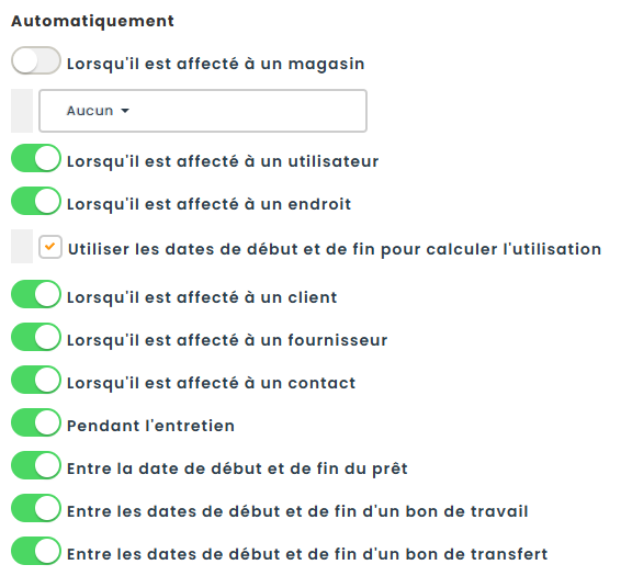 - Lorsqu’un actif est affecté à un magasin, Hector enregistre un événement d’utilisation pour chaque jour où l’actif se trouve dans l’entrepôt. Vous pouvez activer l’option et ensuite filtrer les magasins qui peuvent être utilisés pour le calcul de l’utilisation.