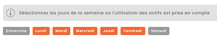 Hector peut utiliser vos jours ouvrables pour mieux comprendre quand enregistrer un événement d’utilisation. Par exemple, si votre organisation est fermée le samedi, vous pouvez décocher cette journée. Hector ignorera les statistiques d’utilisation pour les samedis, afin de donner une meilleure indication du moment où les actifs ont été réellement utilisés.
