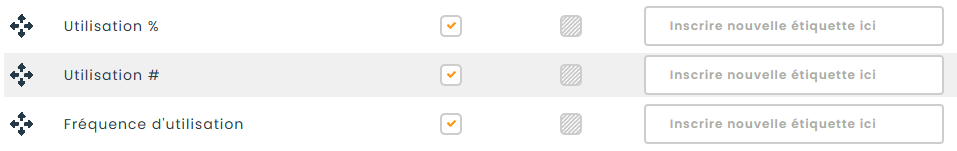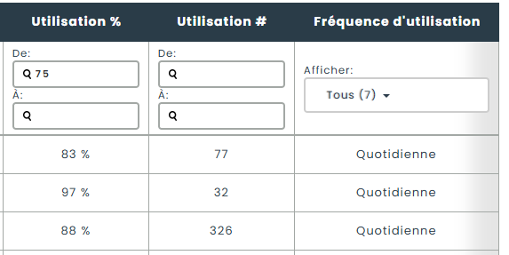 Trois nouvelles colonnes sont disponibles pour les grilles d’actifs et d’items à partir des pages de configuration des colonnes. Ces colonnes affichent des informations sur l’utilisation sous la forme d’un pourcentage, d’un nombre ou d’une fréquence mesurée en jours, semaines, mois ou années. Vous pouvez ensuite filtrer les données comme n’importe quelle autre colonne de l’application.