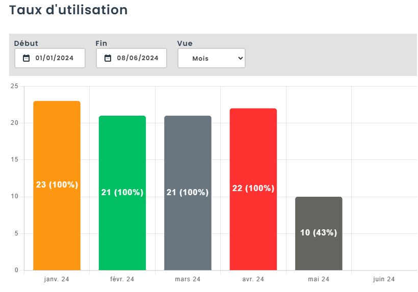 Si vous naviguez vers un actif, un item ou une catégorie, une nouvelle boîte de taux d’utilisation est disponible dans le coin supérieur droit de la page. Si vous cliquez sur cette case, vous pourrez consulter l’historique de l’utilisation au fil du temps.