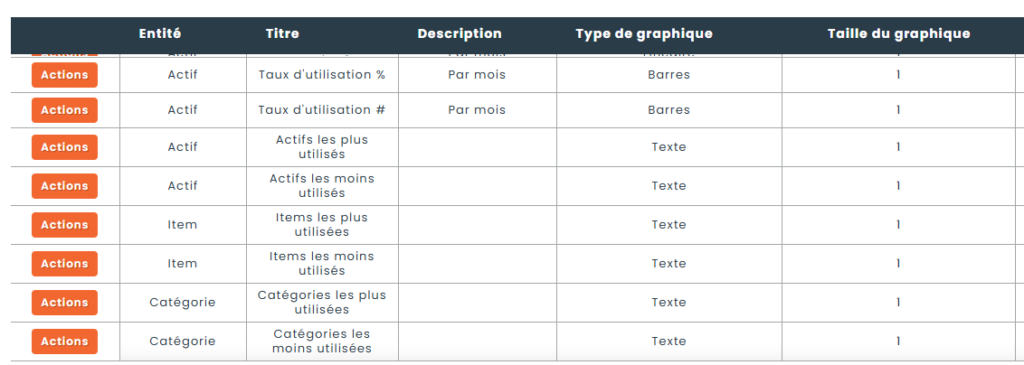 De nombreux nouveaux rapports ont été ajoutés pour suivre l’utilisation par actif, item ou catégorie. Ces rapports peuvent être affichés/masqués par rôle. Voici quelques exemples de rapports qui ont été ajoutés.