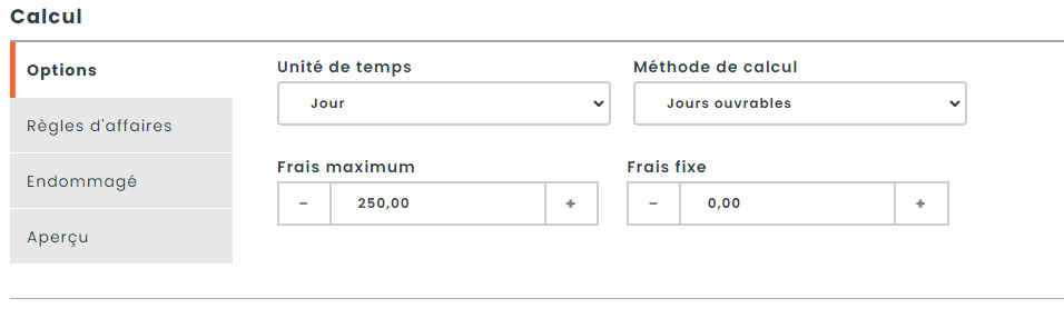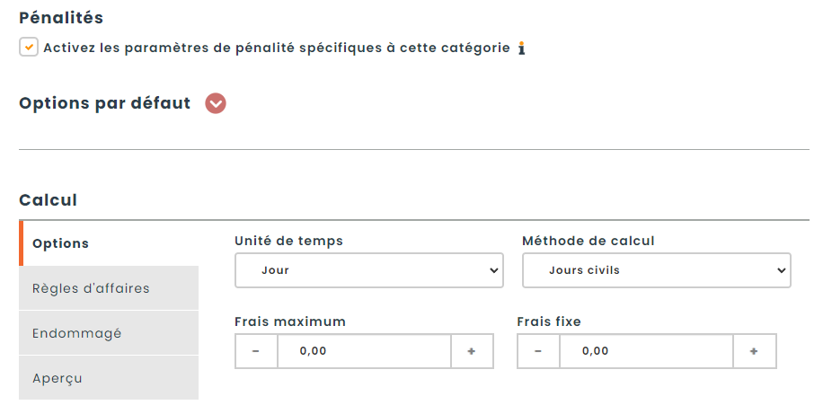 Frais fixe : Indique un montant de pénalité standard qui s’applique indépendamment d’autres facteurs. Ce frais est ajouté automatiquement et constitue un minimum à payer en cas de non-respect des conditions de retour.