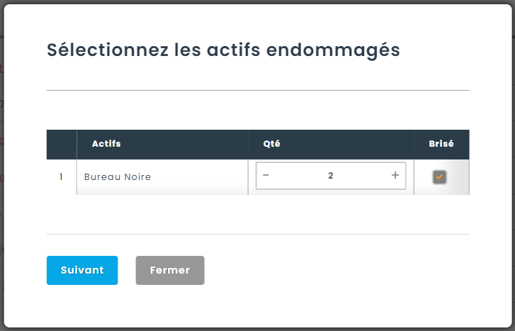 Dans le cas des pénalités reliées à un bris de matériel, il est possible de modifier la sélection des entités endommagées. Cette étape est obligatoire pour les kits afin de renseigné le prix ou pour les éléments ayant une taille de lot afin de déterminer le nombre d’éléments brisés.