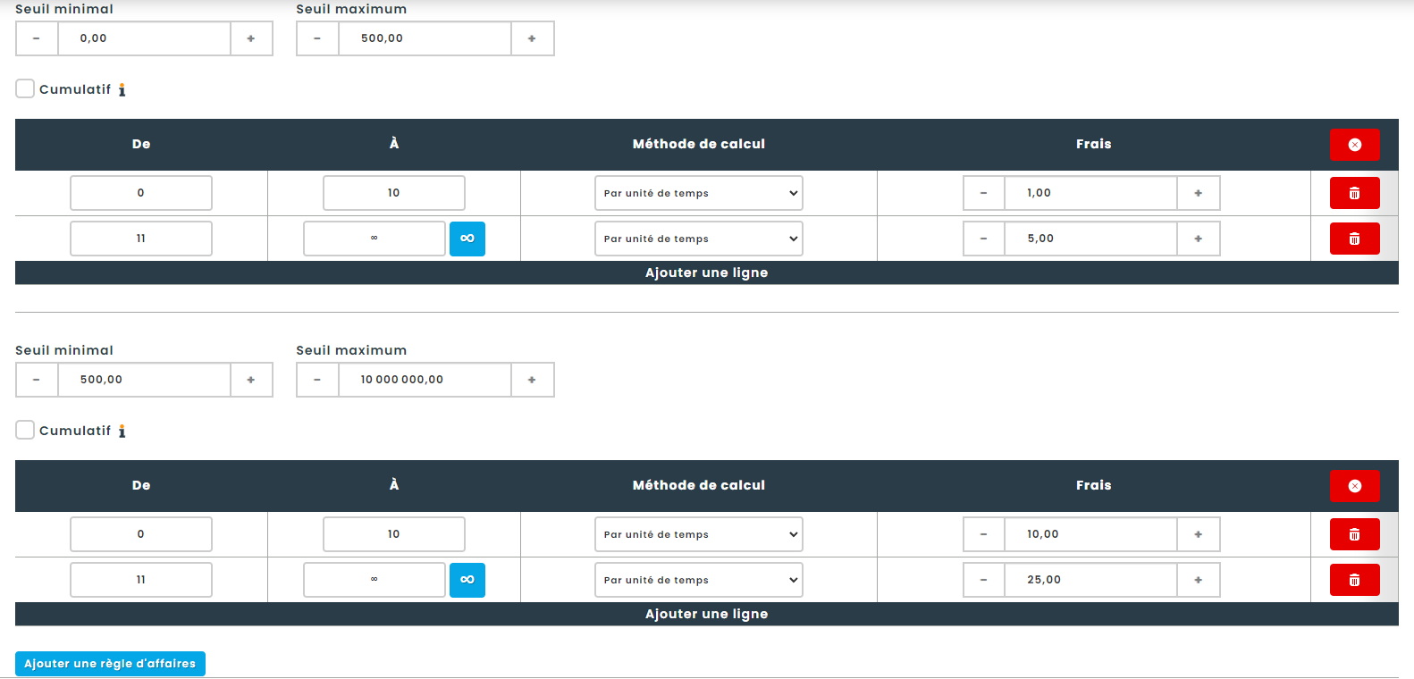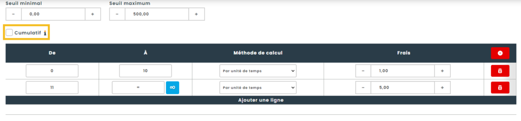Il est également possible de configurer le calcul des pénalités de manière cumulative. Dans ce cas, toutes les lignes de la règle d’affaire pertinente seront prises en compte simultanément pour déterminer le montant total de la pénalité à appliquer.