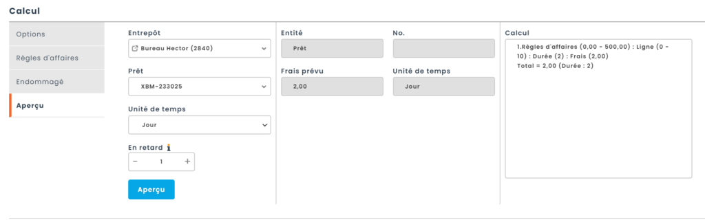 Lorsque le retard est constaté, une pénalité de 1 $ par jour est appliquée pour chaque jour de retard pendant les 10 premiers jours. À partir du 11ème jour et jusqu’au retour du matériel, la pénalité augmentera à 6 $ par jour, correspondant à la somme des frais définis dans la ligne 1 et la ligne 2 de la règle d’affaires.