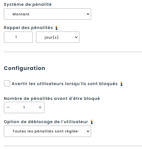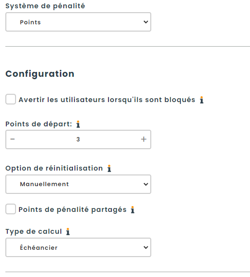 Le système de points suit l’activité des utilisateurs et bloque automatiquement les comptes qui atteignent zéro point. Les points sont déduits en fonction du nombre de pénalités actives dont dispose un utilisateur. Le comportement du système peut être ajusté à l’aide des paramètres décrits ci-dessous, ce qui vous permet de personnaliser la manière dont les points sont supprimés et le moment où les utilisateurs sont bloqués.