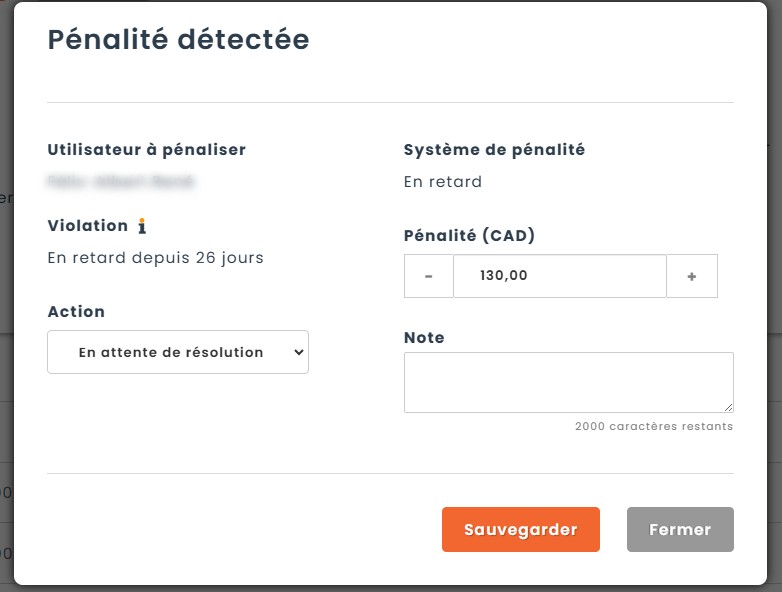 Au moment d’une déclaration d’un bris ou d’un retour d’un prêt, si une pénalité est détectée, une fenêtre s’ouvrira avec le rapport de la pénalité. Sur cette page, il vous est possible d’adapter manuellement le montant ou pointage de la pénalité et vous devrez ensuite choisir une action en fonction de la résolution souhaitée :