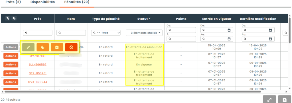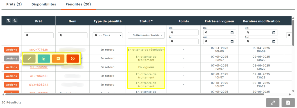 Dépendamment de l’action à effectuer sélectionné sur la pénalité lors de la complétion du prêt, les pénalités présentées seront aux statuts suivants: