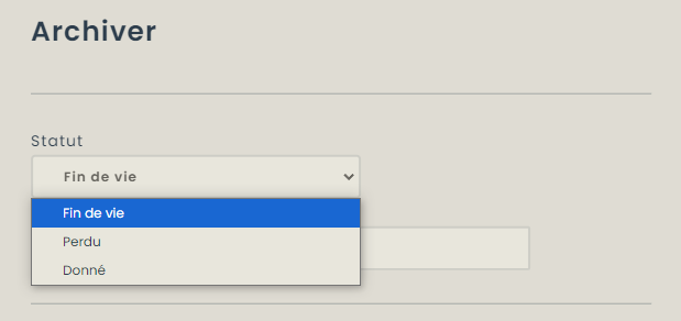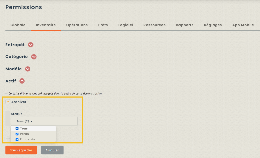 Vous pouvez configurer les rôles ayant la permission d’utiliser les différents statuts d’archivage, si nécessaire, à partir de la section Actif de l’onglet Inventaire :