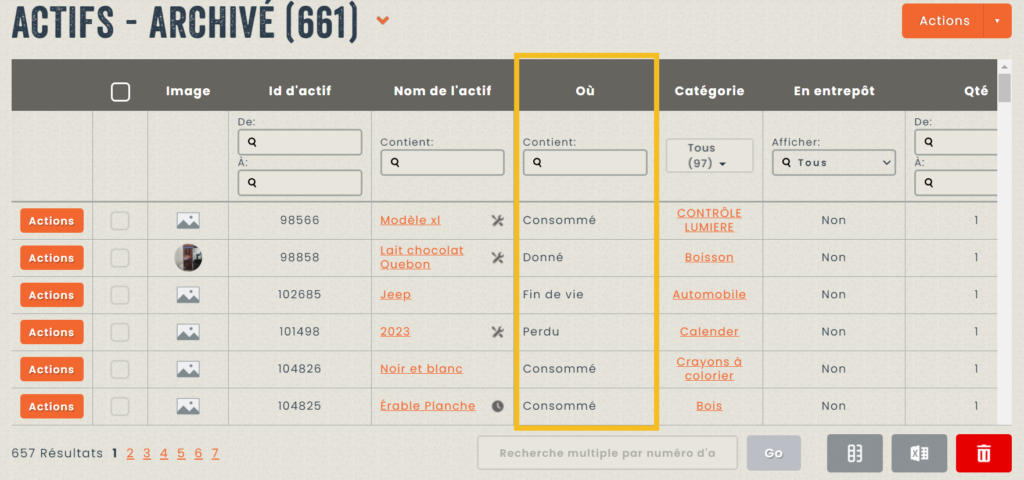 Pour retrouver facilement vos actifs archivés, accédez à la section Archivé dans le menu déroulant de la page de visualisation de votre liste d’actifs: