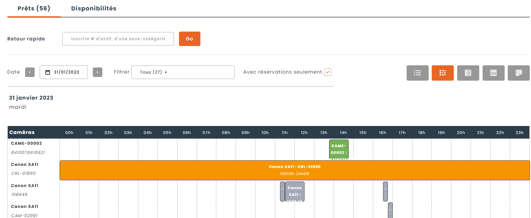 - Plusieurs vues de calendrier sont maintenant disponibles pour vous aidez à mieux suivre l’état des réservations et le retour des prêts. Parmi les nouvelles vues disponibles, il y a la vue chronologique (affichée plus bas), la vue par jour, par semaine et par mois.