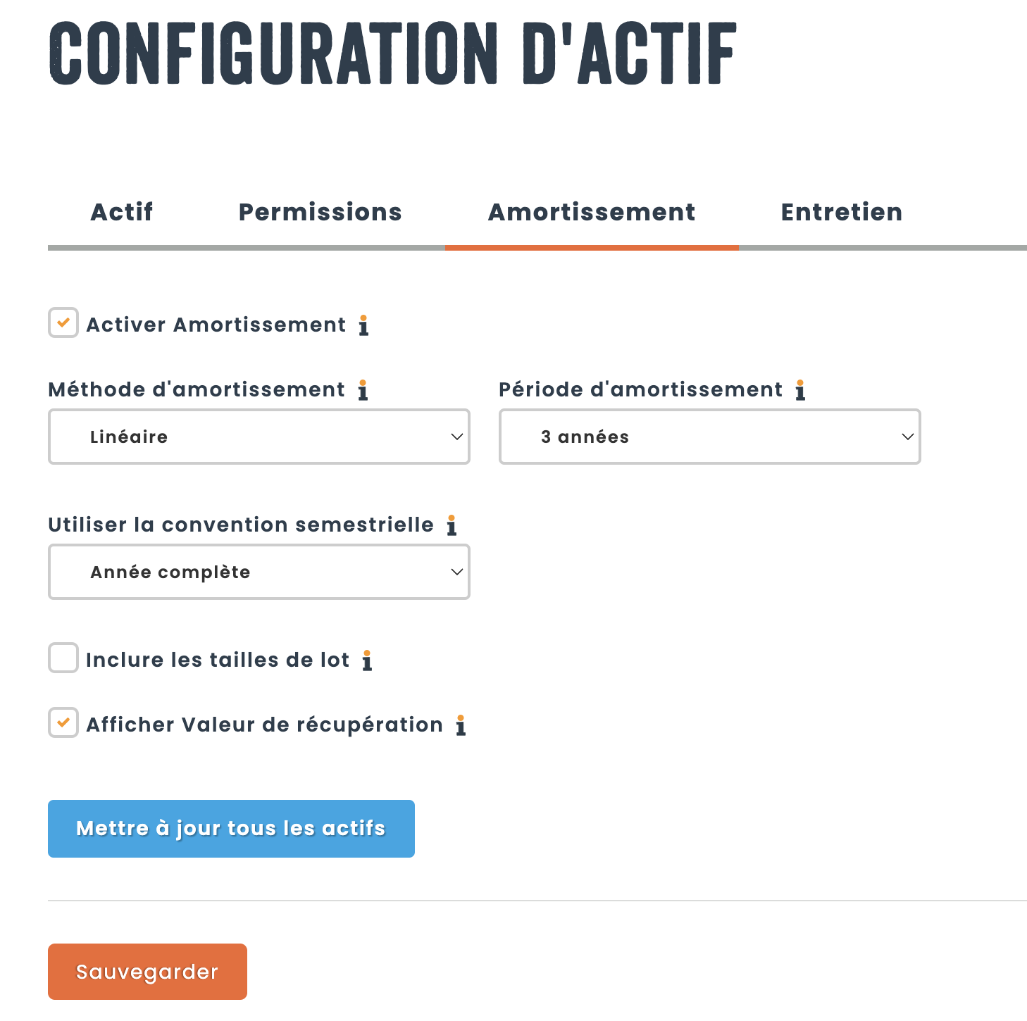Rendez-vous dans la section « Amortissement » afin d’activer l’amortissement et de configurer vos paramètres. Vous pouvez en apprendre plus sur les différentes méthodes d’amortissement dans l’article suivant. Appuyez sur  « sauvegarder » afin d’enregistrer vos modifications.