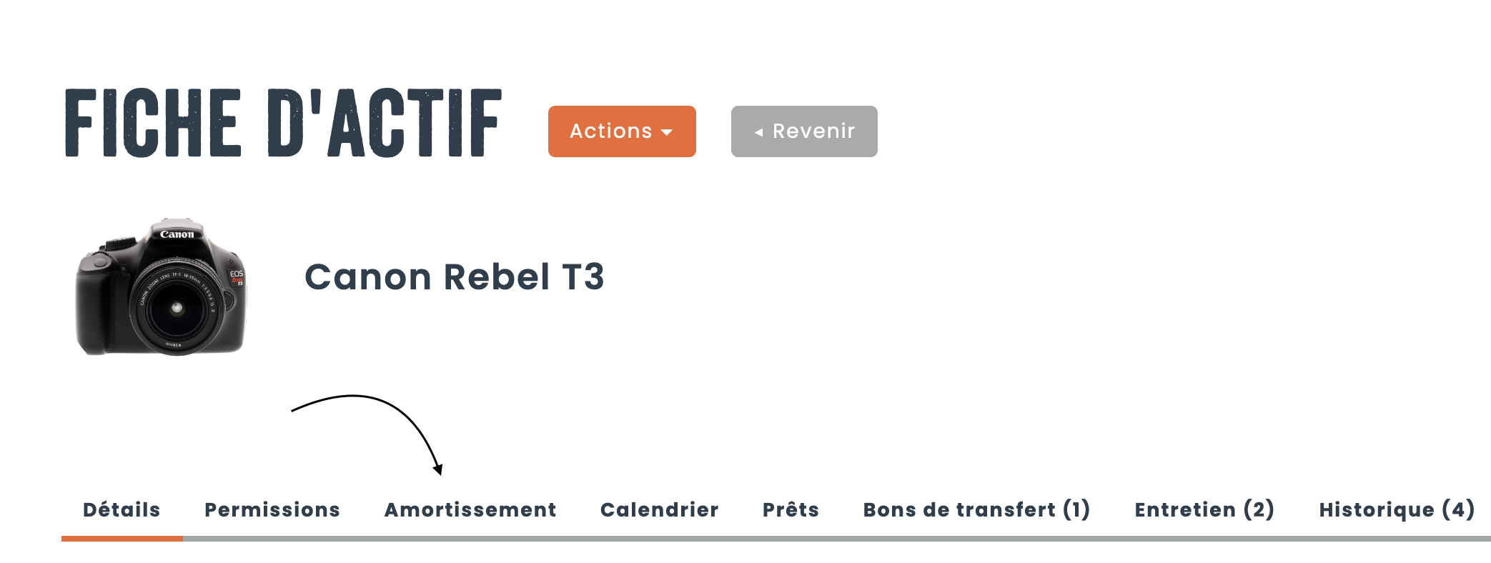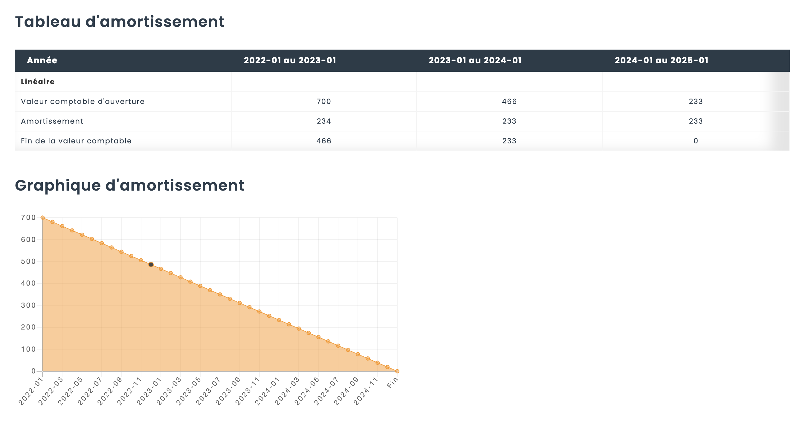 Lorsque vous naviguez vers un actif individuel, un onglet nommé Amortissement est disponible et celui-ci va vous permettre de visualiser l’amortissement de l’actif à travers le temps sous format tableau et graphique. Lorsque vous passez par-dessus un point spécifique dans le graphique, un libellé va vous permettre de connaitre la valeur nette d’un actif à ce moment dans le temps.