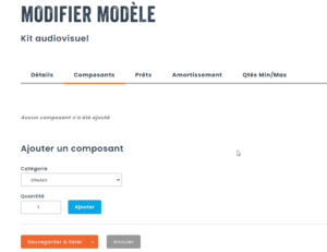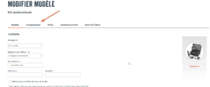 Lorsque vous créez une sous-catégorie à partir d’une catégorie où les kits sont activés, un nouvel onglet va devenir disponible, vous permettant d’ajouter des composants à votre kit. Ceci correspond uniquement à la structure du kit, les actifs ne sont pas ajoutés à ce stade-ci.