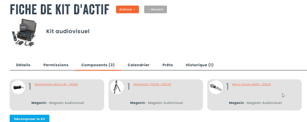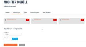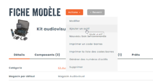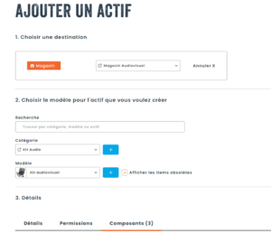 Afin de créer des kits d’actifs, il est important d’avoir créé au préalable des composants dans des catégories distinctes du kit en soi. Les composants peuvent être des actifs provenant de catégories gérées individuellement (avec numéro d’actif) et/ou gérées en lot (consommables ou matériel de faible valeur en grande quantité).