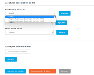Si l’option d’ajout automatique des actifs est désactivée, il faut alors sélectionner manuellement les composants existants associés au kit. Il vous est aussi possible d’ajouter d’autres actifs ne faisant pas partie des composants pré-sélectionnés. Vous pouvez les ajouter via la case « Ajout par numéro d’actif » :