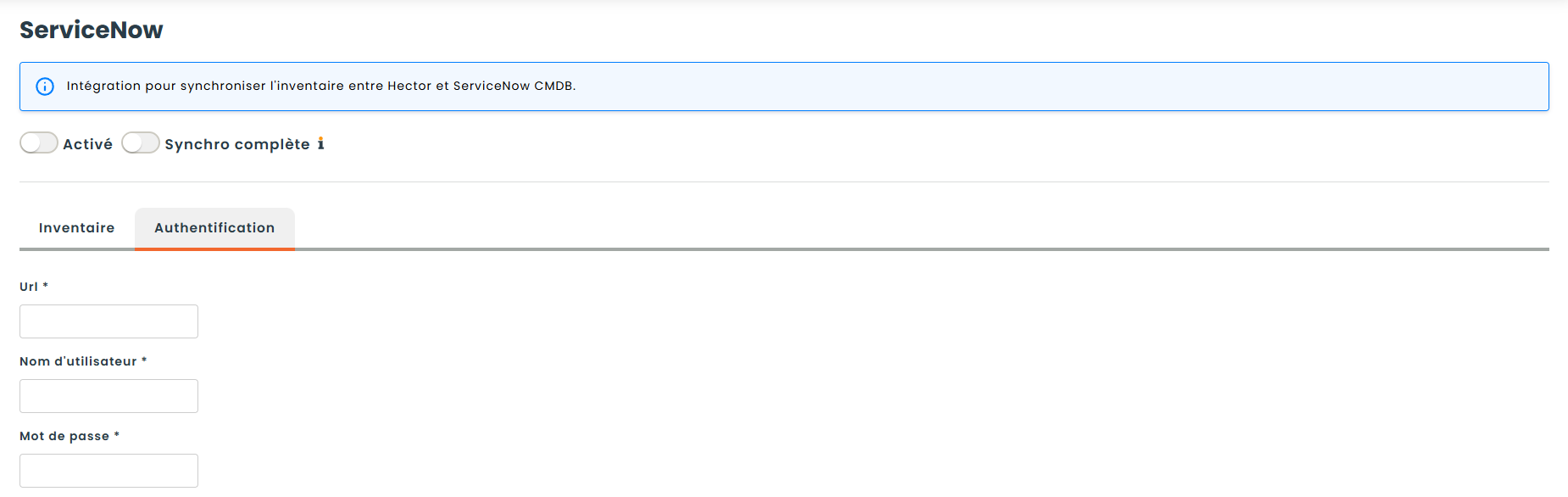 Maintenant que votre instance ServiceNow est prête, vous pouvez configurer l’intégration dans Hector. Naviguez vers Paramètres > Intégrations > Inventaire > ServiceNow et cliquez sur Ajouter.