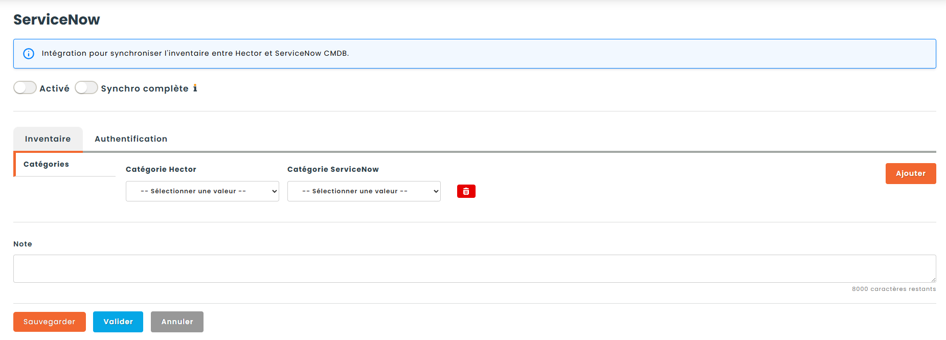 Cliquez sur Valider. Lors de la validation, Hector teste l’accès API à chaque table ServiceNow requise (catégories, entreprises, modèles, utilisateurs, emplacements, actifs et champs CI). Si une table est inaccessible — en raison d’identifiants incorrects, de rôles manquants ou de problèmes réseau — la validation échouera avec un message d’erreur spécifique.