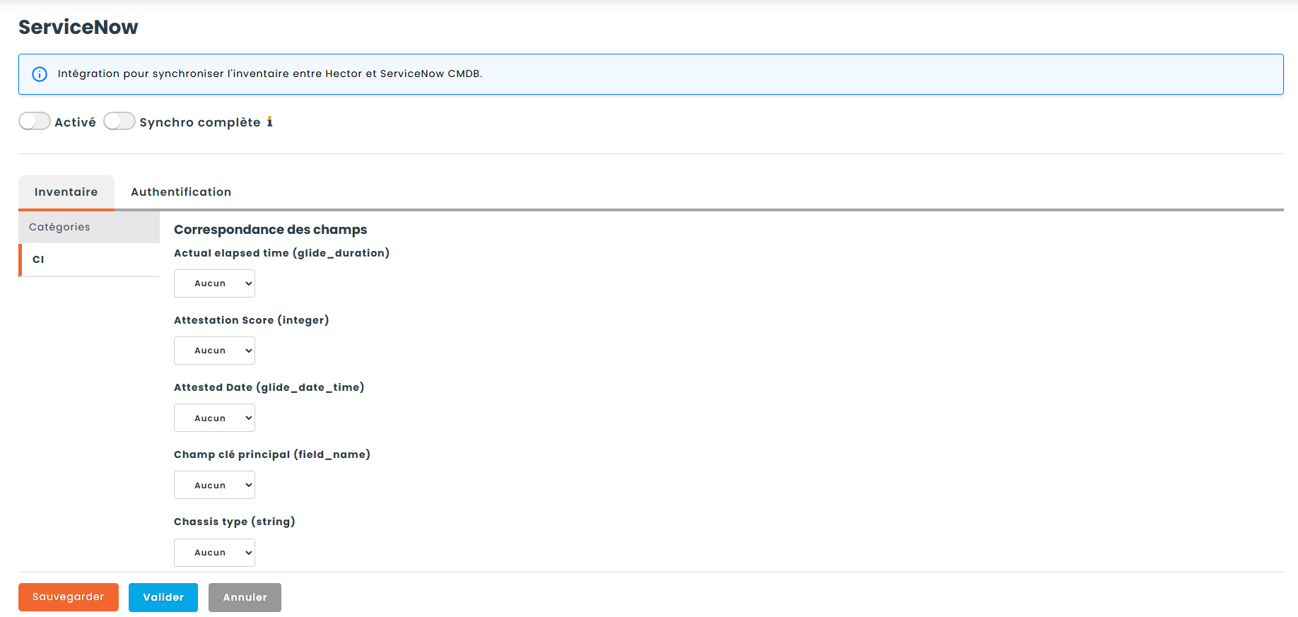 Une fois que vous avez enregistré au moins un mapping de catégorie, le sous-onglet Champs CI devient disponible. Cette étape est optionnelle mais recommandée si vous souhaitez pousser des données Hector supplémentaires dans les éléments de configuration ServiceNow au-delà des champs d’actifs de base.