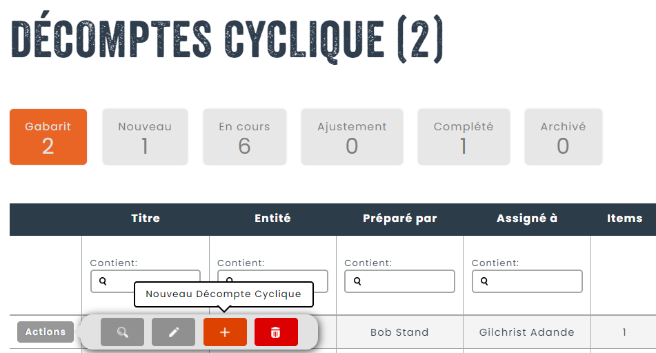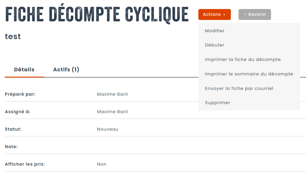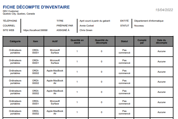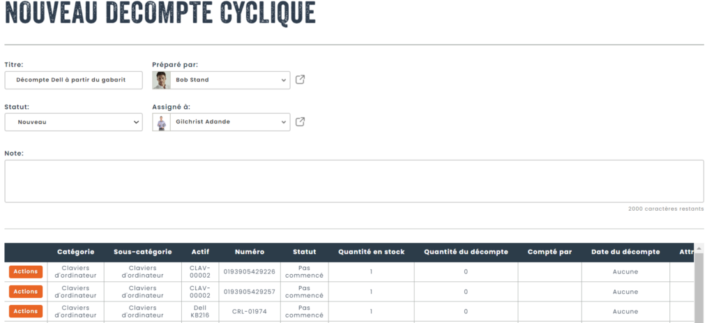 Tous les actifs appartenant à l’entité (dans notre cas, un magasin) et les items spécifiées seront importés dans le décompte. Vous remarquerez également un champ qui ne figurait pas dans le gabarit, c’est-à-dire, le champ Statut, qui vous permettra de suivre la progression du comptage.