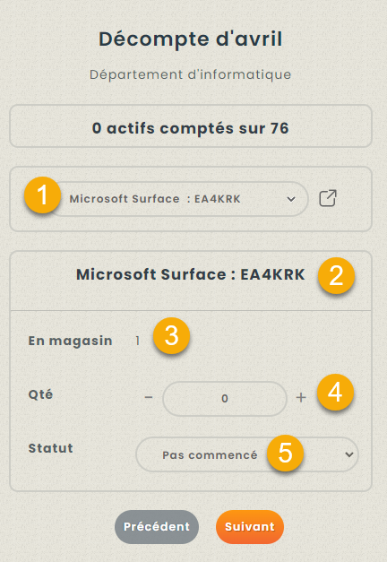 Hector recommandera les actifs à compter sur la base des actifs en stock. Si l’employé veut compter un autre actif, il le saisira à l’endroit où le symbole (1) est indiqué. Sinon, il trouvera et comptera l’actif sur l’écran (2). Si le comptage à l’aveugle n’est pas activé, il verra combien de biens sont en stock (3). Enfin, il saisit la quantité comptée (4) et change le statut en trouvé (5).