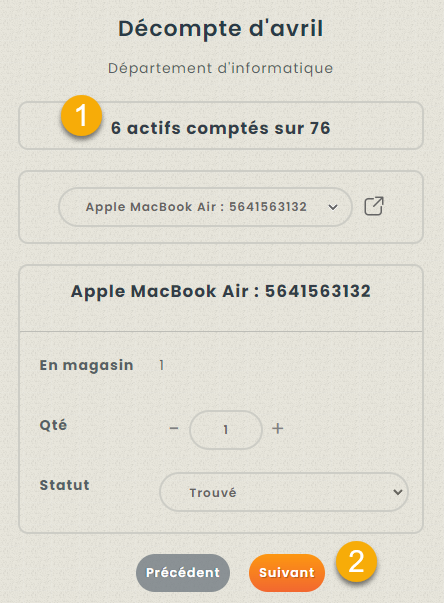 En haut du décompte, ils auront un indicateur visuel de la progression du décompte. Ils peuvent cliquer sur le bouton Suivant (2) chaque fois qu’ils ont compté un actif. Hector leur proposera le prochain actif, ou ils peuvent scanner à nouveau pour trouver l’actif qui se trouve devant eux.