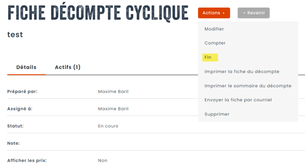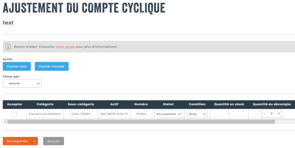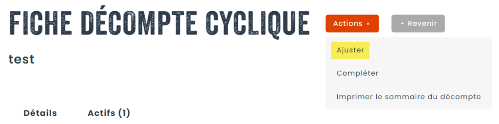 Si des actifs ont été signalés comme manquants, ou si des actifs avec des quantités multiples avaient des quantités différentes de celles en stock, l’étape d’ajustement permet de corriger l’inventaire selon les résultats du comptage.