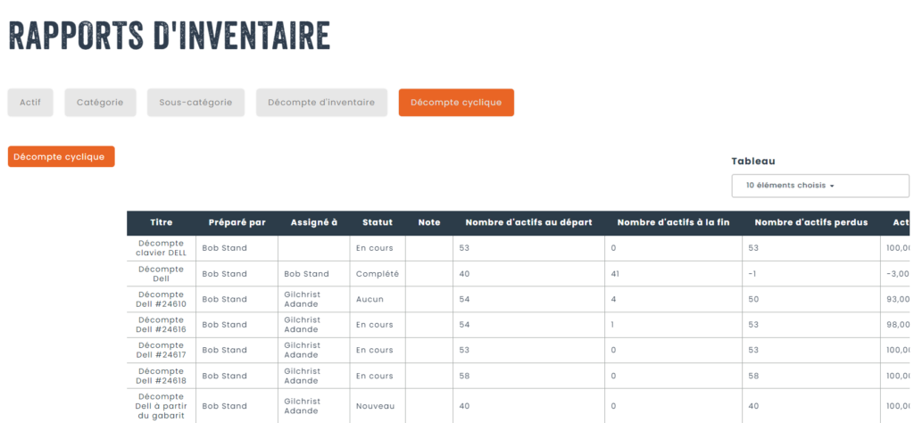 Ensuite, cliquez sur l’onglet Décompte Cyclique pour voir les rapports disponibles. Un rapport contient une liste des décomptes avec des statistiques sur le nombre d’actifs comptés, le nombre d’actifs manquants et la valeur globale des actifs trouvés par rapport aux actifs manquants.